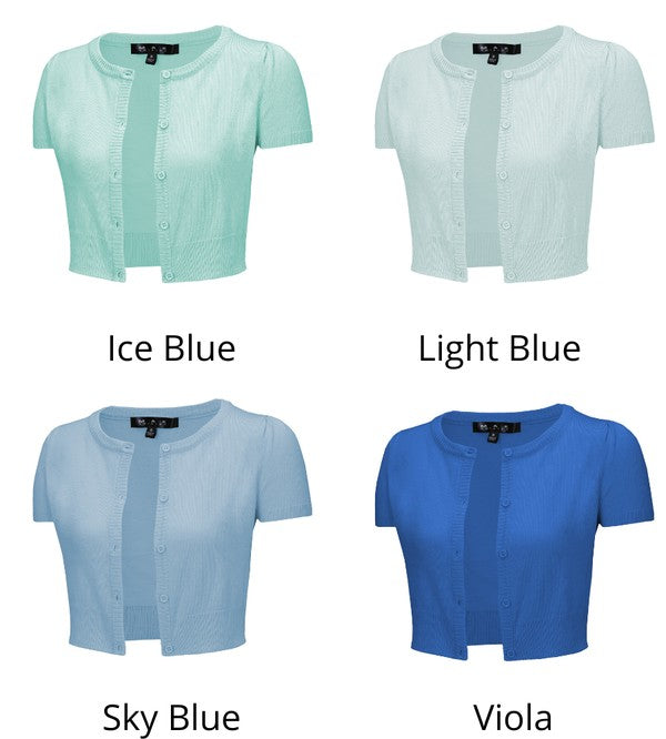 - 15-16" Crop Length, Puffed Cap Short Sleeve, Round Neck, Bolero Knit Cardigan Sweater