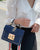 An interesting mix of soft, faux suede and vegan leather adorned with round gold studs and chain detail on flap. Gold statement closure and top handle.
