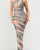 It features an asymmetric one-shoulder neckline with a complex pattern of metallic bandage strips overlaid on nude mesh inserts, creating a striking contrast and an illusion of a curvaceous silhouette. The dress's knee-length hem is suitable for cocktail events and semi-formal gatherings. The shimmering texture of the metallic elements adds a touch of glamour, making it an eye-catching piece for evening wear. The use of mesh inserts not only adds to the visual appeal but also strategically enhances the body's contours.