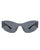 Futuristic rimless shield sunglasses featuring a sleek wraparound lens and bold side detailing for a modern, sporty look.